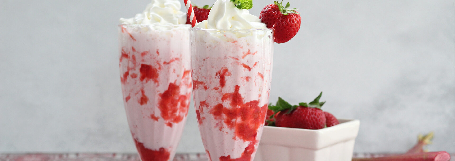 - To serve, smear the remaining strawberry rhubarb sauce in glasses, pour in the milkshake and top with whipped cream and a strawberry if desired.